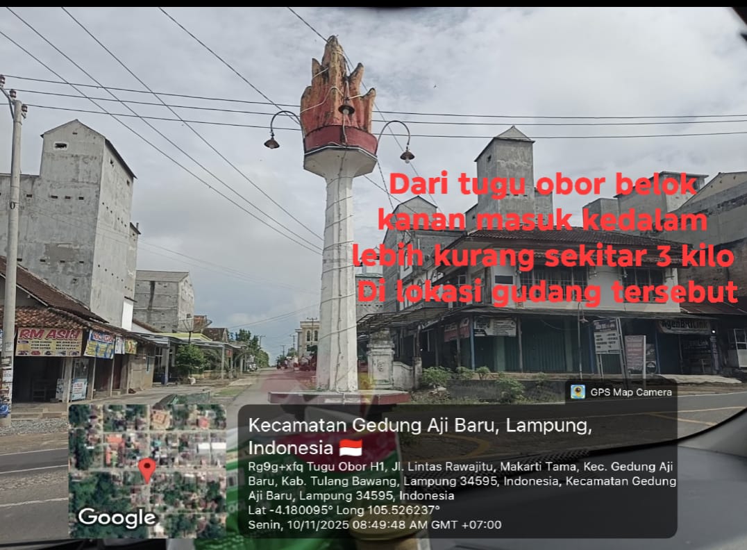 Tim Investigasi86.com turun langsung ke lapangan pada Senin (10/11/2025) pukul 08.00–10.00 WIB. Perjalanan dimulai dari Tugu Obor kecamatan Gedung Aji Baru Lampung tepatnya di Jl. Lintas Rawajitu Makarti Tama kecamatan Gedung Aji Baru kabupaten Tulang Bawang provinsi Lampung.