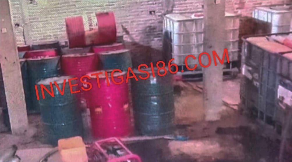 Tim Investigasi86.com berhasil mengambil dokumentasi foto bagian dalam gudang, yang memperlihatkan puluhan drum besar dan belasan box berisi bahan kimia diduga digunakan untuk proses pengoplosan BBM.