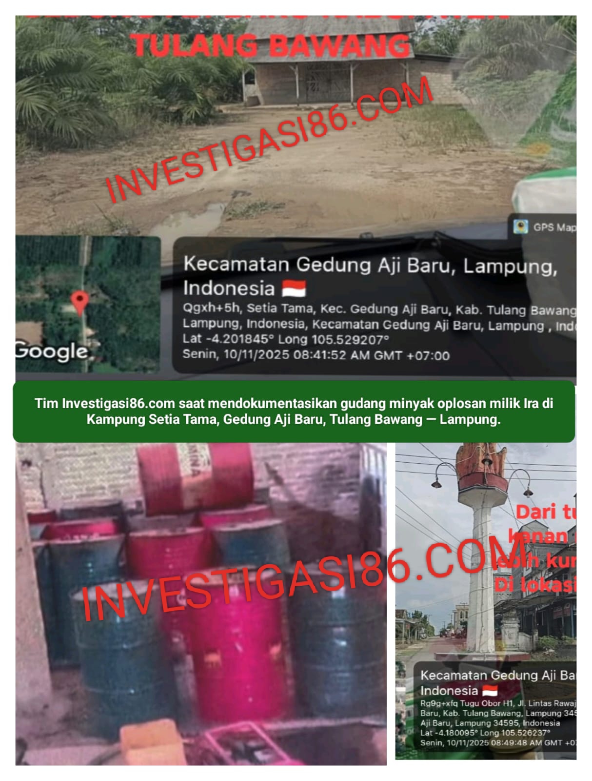 Berdasarkan penelusuran tim investigasi media Investigasi86.com, terungkap dugaan kuat bahwa sebuah gudang misterius di Kampung Setia Tama kecamatan Gedung Aji Baru kabupaten Tulang Bawang provinsi Lampung diduga menjadi pusat aktivitas pengoplosan minyak ilegal berskala besar.