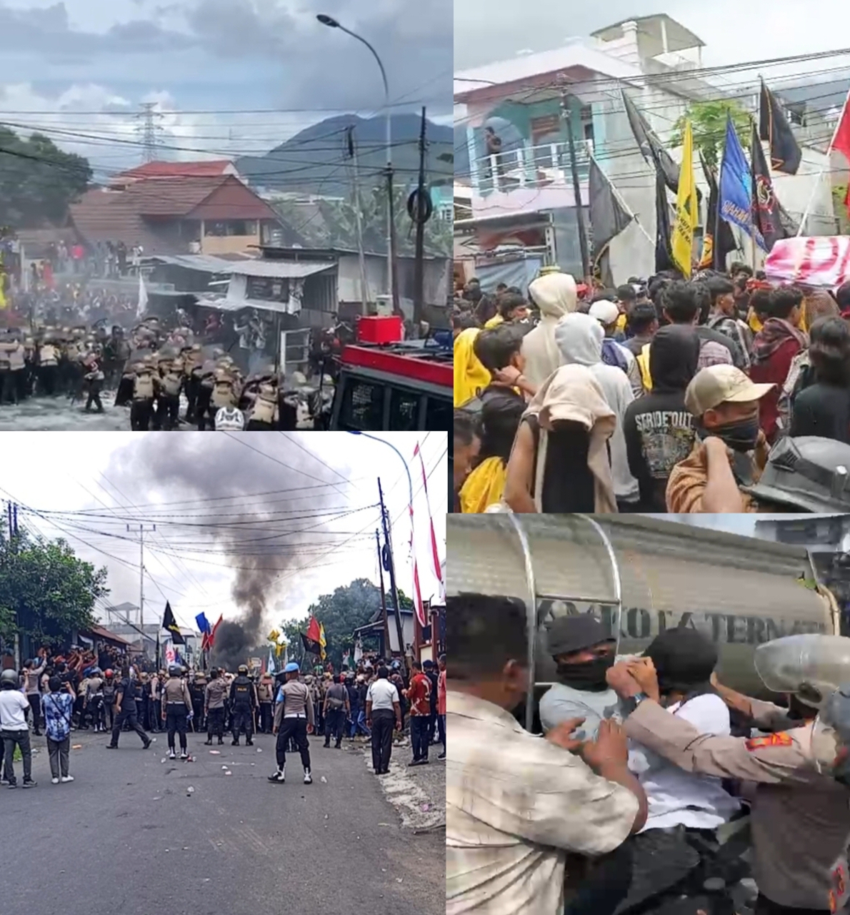 Bentrok antara ribuan mahasiswa dan pihak aparat Kepolisian tak terelakkan, hujan batu mengudara ke arah aparat Kepolisian, menghantam satu mobil water Cannon milik Resmob Polda Maluku Utara asap hitam tebal membubung ke udara membungkus areal Kantor DPRD akibat sejumlah ban bekas dibakar masa Aksi. Namun pertahanan barekade Polisi terus menggempur masa Aksi yang terpukul mundur hingga puluhan meter ke lokasi tugu Kalumata, situasi Kota mulai mencekam hingga magrib karena gesekan mahasiswa dan Aparat terus memanas.