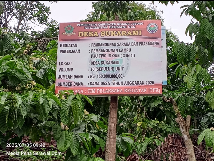 Tahun 2025 ini desa Sukarami kecamatan Bermani Ulu Raya melalui program Dana Desa (DD)mengucurkan dana sebesar RP.150.000.000,-untuk kegiatan pengadaan lampu PJU two in one sebanyak 10 unit yang siap menerangi desa Sukarami dan sekitarnya.Pengadaan lampu jalan ini telah berjalan dari tahun 2024 silam hingga saat ini.