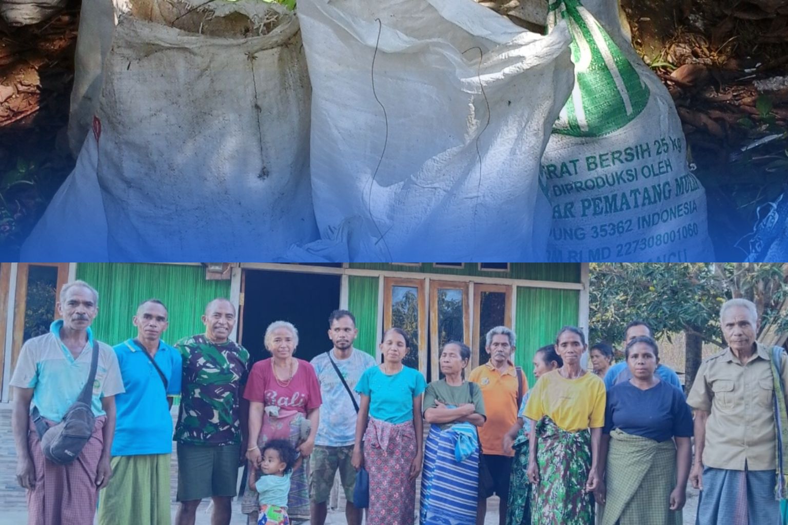 Ironisnya, warga justru dipaksa berpose untuk dokumentasi penyaluran bantuan dengan karung berisi jagung, jerigen kosong lima liter, bahkan karung pasir, seolah-olah bantuan beras benar-benar sudah diterima.