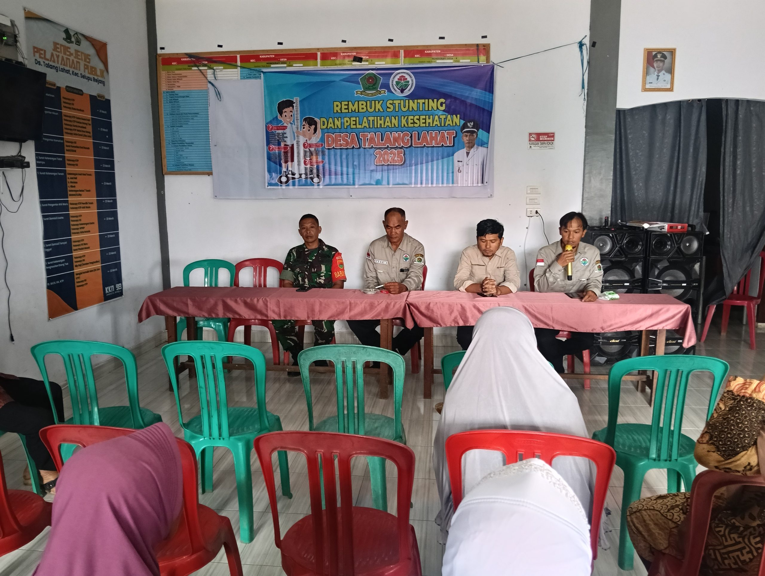 Terkait  kegiatan rembuk stunting dan pelatihan kesehatan kader desa talang lahat,kepala puskesmas sumber Urip Erwina,SKM,sebagai Nara sumber menyampaikan bahwa tujuan diadakannya kegiatan Stunting desa merupakan upaya dari pemerintah untuk menekan angka anak yang mengalami kelainan gizi atau yang sering disebut kurang gizi.Disampaikannya bahwa anak yang berumur dibawah 2 tahun sering mengalami gagal tumbuh akibat kekurangan gizi kronis selama 1.000 Hari Pertama Kehidupan (HPK), yang dapat menghambat pertumbuhan fisik, perkembangan kognitif, dan berdampak jangka panjang pada kualitas hidup anak.