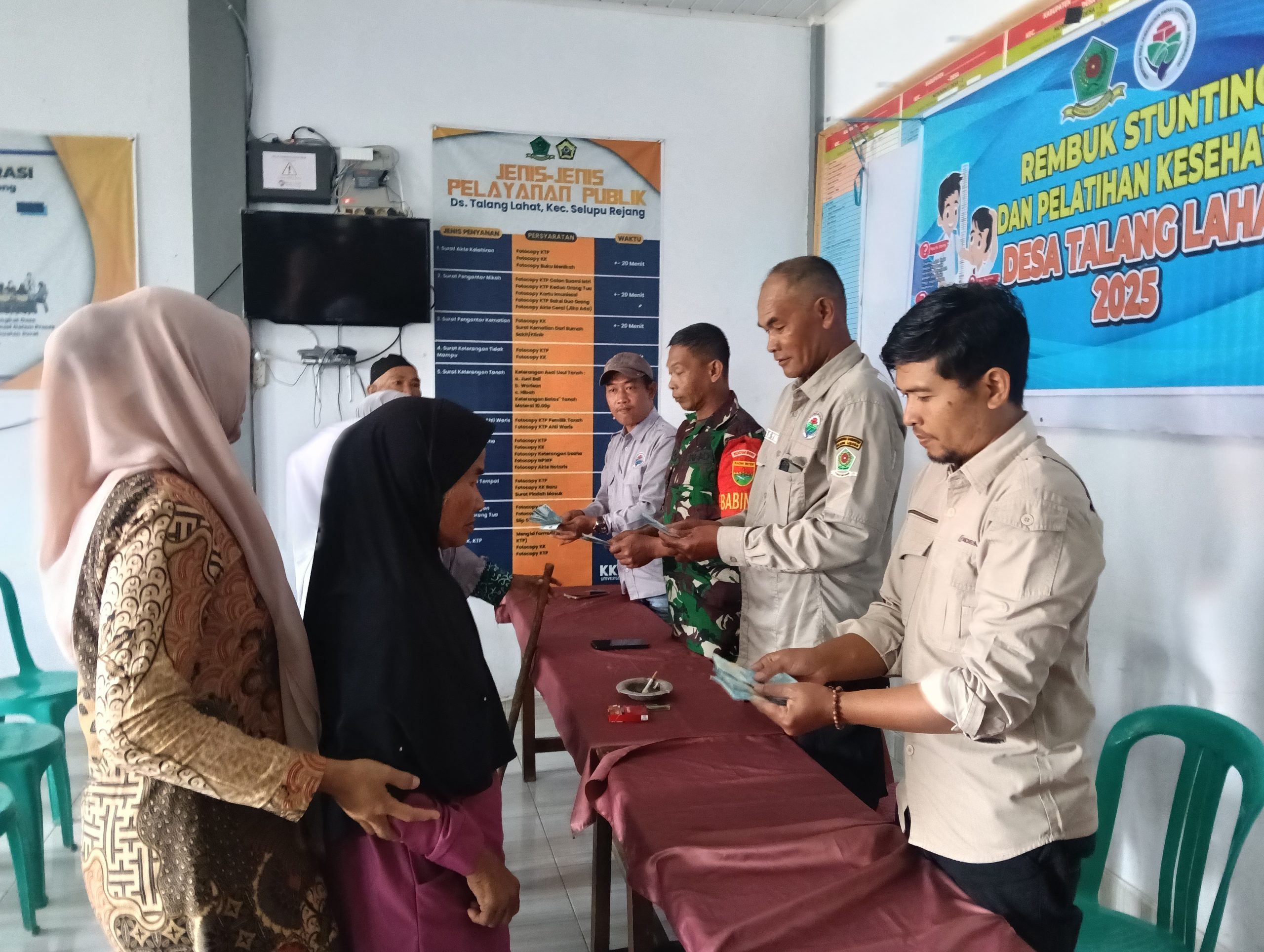 Rejang Lebong,investigasi86.Bertempat di balai desa talang lahat kecamatan selupu rejang kabupaten rejang lebong,kamis (24/09/2025) Sekira pukul 09.30 wib telah dilaksanakan pembagian BLT sekaligus musyawarah rembuk stunting dan pelatihan kesehatan.