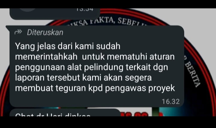 Ditemui dilokasi pekerjaaan ,Iw sebagai pengawas lapangan mengatakan kepada rekan jurnalis bahwa sebenarnya alat pelindung diri seperti Helm telah disiapkan oleh perusahaan,namun kebetulan para pekerja sedang tidak memakai.”Kami telah menyiapkan Helm sebagai pelindung diri,tapi pekerja ini nampaknya tidak mau menggunakannya,”ujar pengawas tersebut.